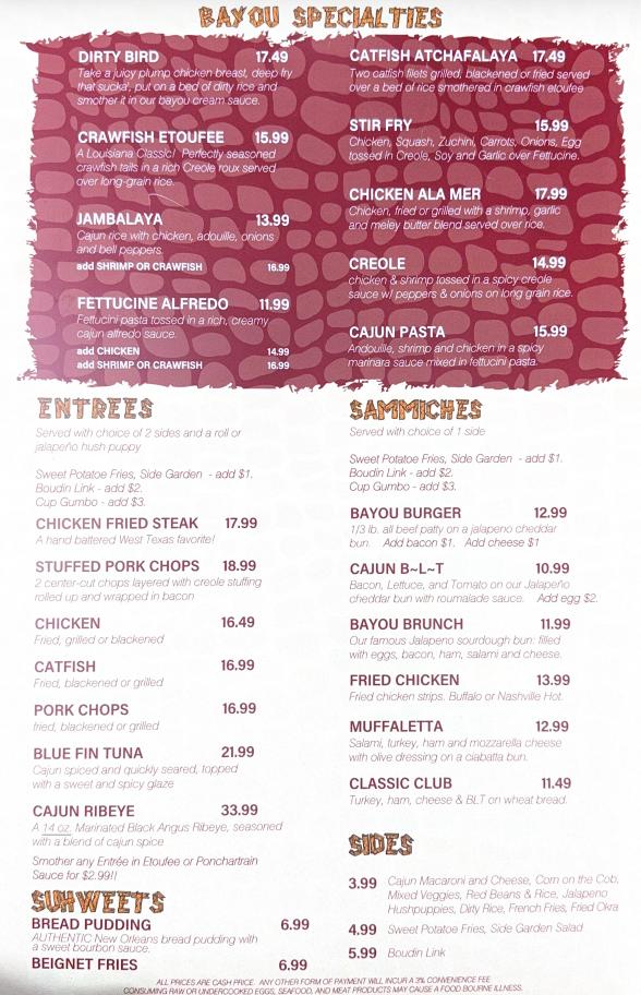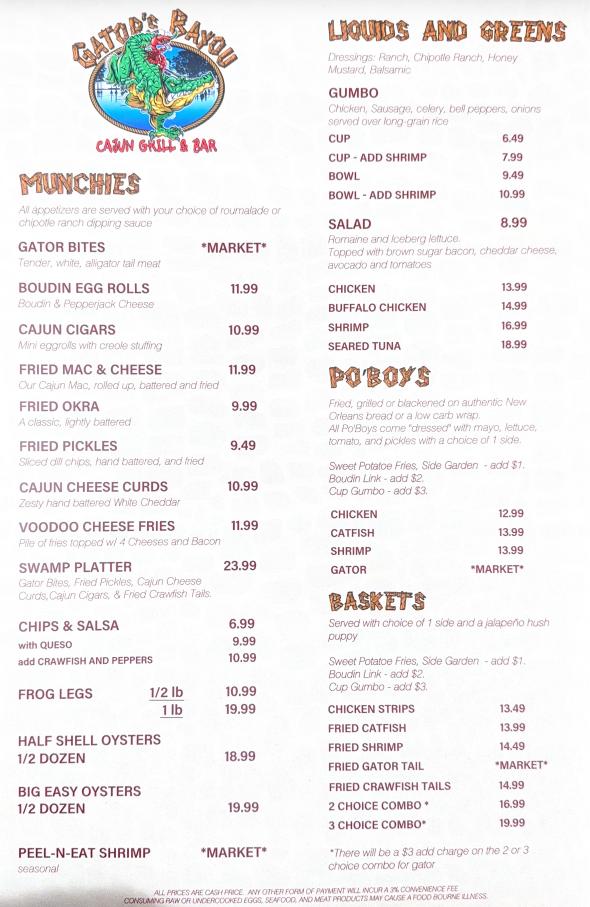 Gator’s Bayou Cajun Grill & Bar OUR DELICIOUS MENU MAIN MENU KIDS EAT FREE ON TUESDAYS! Kids 12 and under from the kid’s menu only.